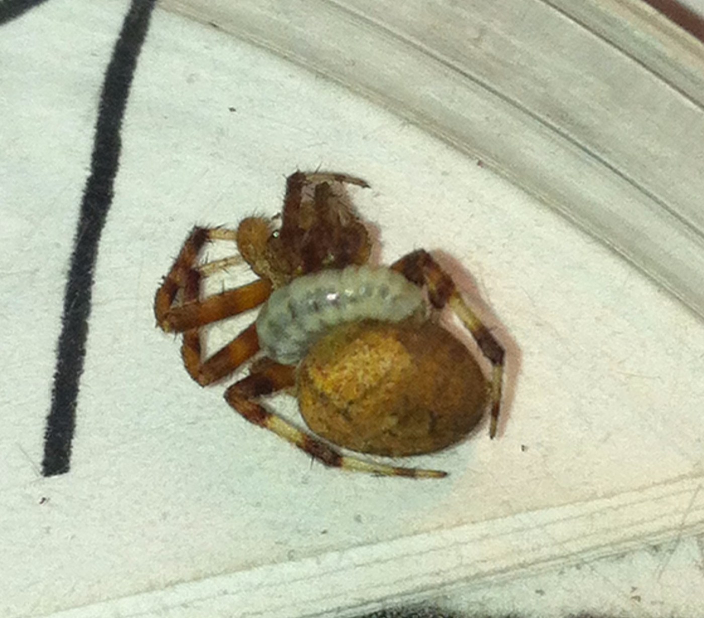 So far, the spider is doing normal spider stuff, but I’m thinking it has little chance of getting out of this predicament. The spider may have been infected while in the egg sac or caught while out and about.