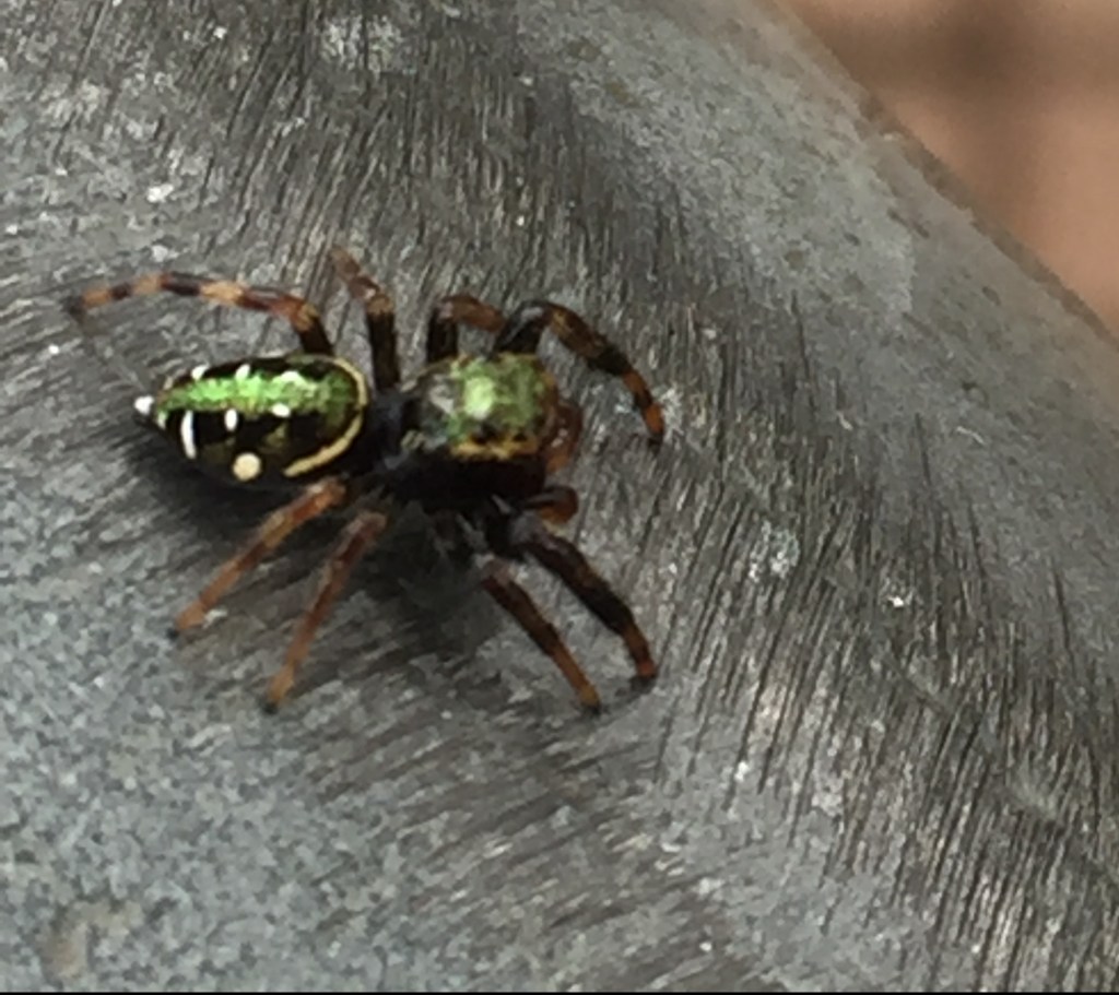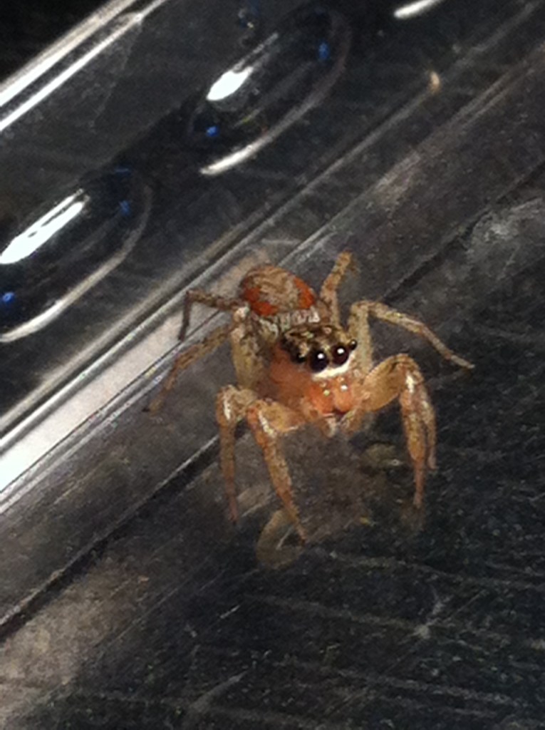 Speaking of visual, let’s talk about those peepers! Jumping spiders seem to be smarter than the average spider (studies have highlighted the cognitive ability of the Portia genus, see reference below) due to their excellent vision. All jumping spiders have eight eyes with huge anterior median eyes that can focus an image like a telephoto lens. They can see details like cracks and holes to hide or go through and escape containers. Jumping spiders can move the retinas of their anterior median eyes almost like we can move our eyes without moving our heads. Check out the nearly translucent Magnolia jumper’s eyes in this video! They can see color, too, which is super important for courtship. Like birds, the male jumping spiders are the colorful ones while the females are cryptically colored. Male jumpers can also sport crazy crowns, elongated jaws, or extra long front legs all to get the female’s attention. The aptly named peacock jumping spiders of Australia take the cake in elaborate courtship auditions. Fun video tag here.