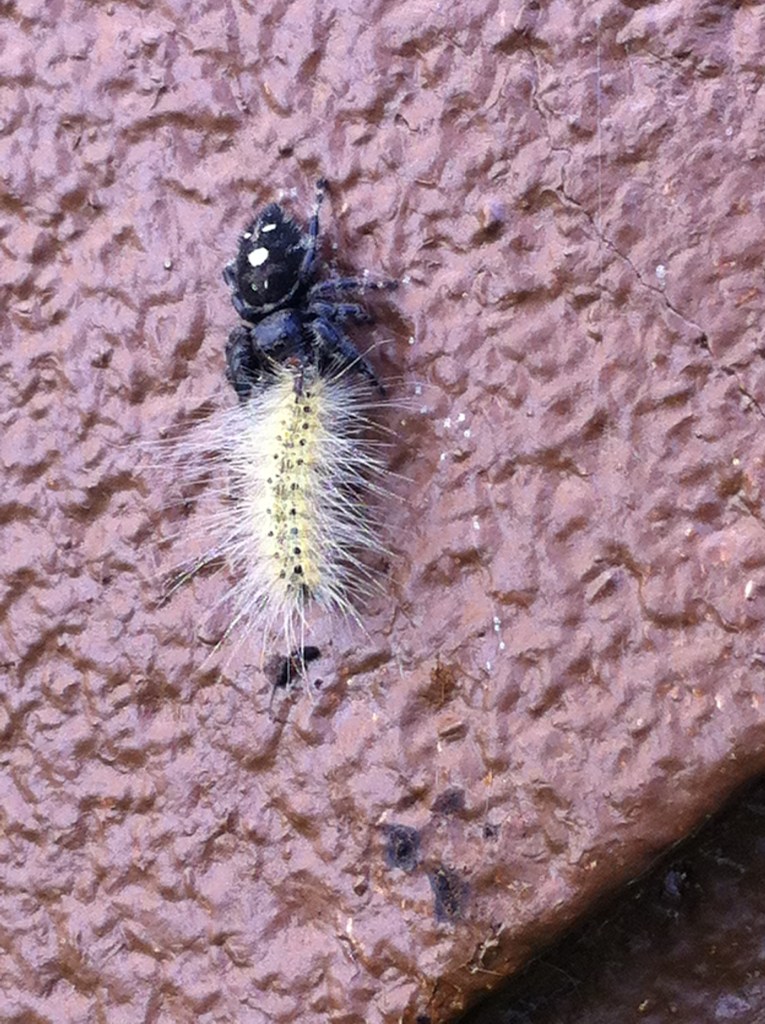 Bold jumpers are curious and will hop right onto your hand to check you out if you let them. One day, when I was a kid, a bold jumper visited my front porch. The family dog and I were hanging out there in the sunshine when a sizable female Phidippus audax appeared. When the spider passed by the dog, who was a medium-sized Shepherd mix, the dog sniffed at the spider. The spider took a few steps back and then jumped on and off the dog’s nose. The dog was like, “What the heck?” and sniffed at the spider again! The spider did the same thing and I couldn’t stop laughing when the dog, snorting, actually got up and left the spider to continue its path.
