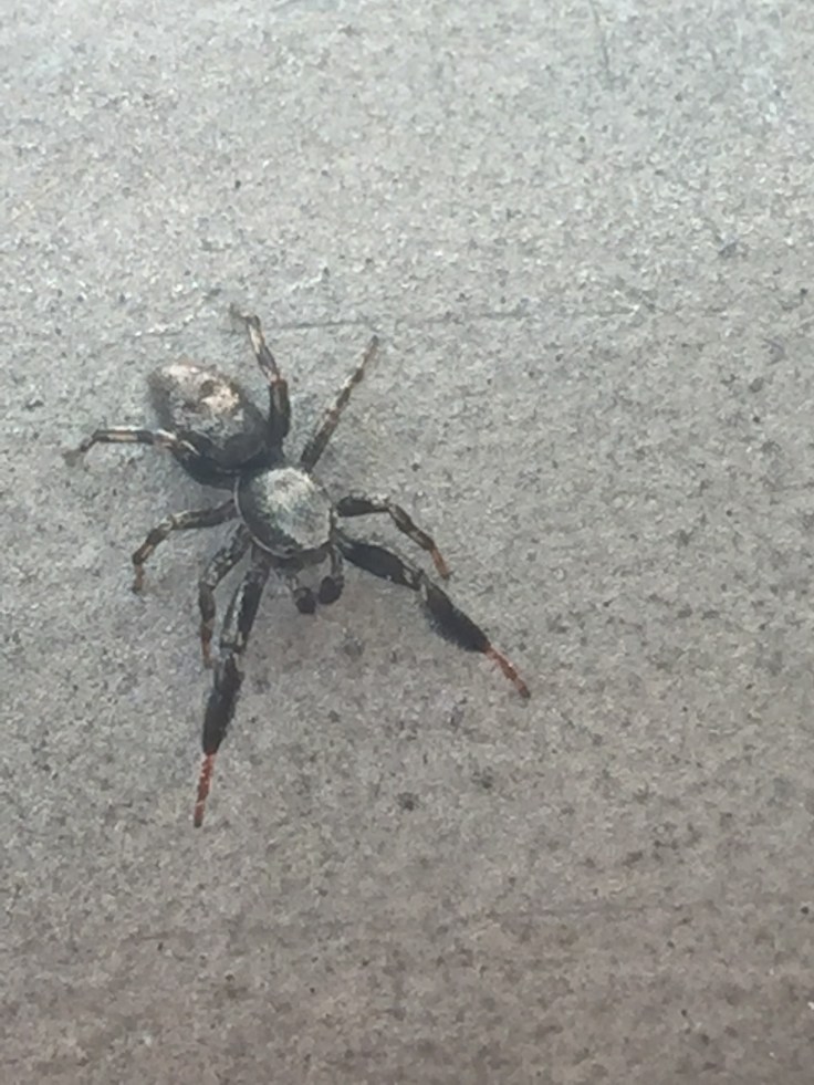 Back to Western, PA – The Bold Jumper, Phidippus audax, is one of our largest jumping spiders found around Pittsburgh. Maxing out at almost an inch head to butt, the Bold Jumper is mostly black with three white spots on its back. The chelicerae (basal part of the fangs) are an iridescent green. They don’t have courtship dances that are as serious as the Australian peacock jumpers, but it’s still highly visual with leg waving and frontal approaches. Check out this video of a male and female bold jumper who meet on opposite sides of a jar!