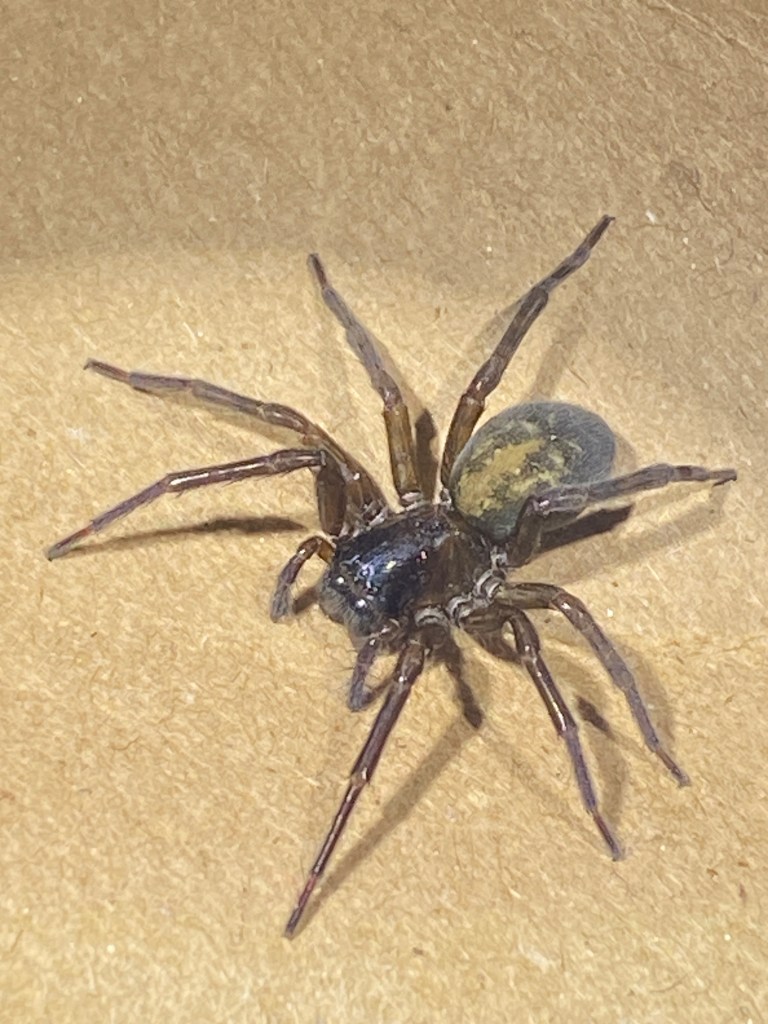 Another look alike is a dark, thick spider called a hacklemesh weaver (Amaurobiidae family). The hacklemesh weaver is another harmless, beefy, brown spider that likes the dark. Hacklemesh weavers don’t have the two stripes on their heads. Their heads are bald, shiny, and kind of squarish. And their legs are shorter and thicker. Lastly, Hacklemesh weavers don’t make flat funnel webs like the barn funnel weavers do which is a giant clue, but when both are free roaming, a closer look is necessary.