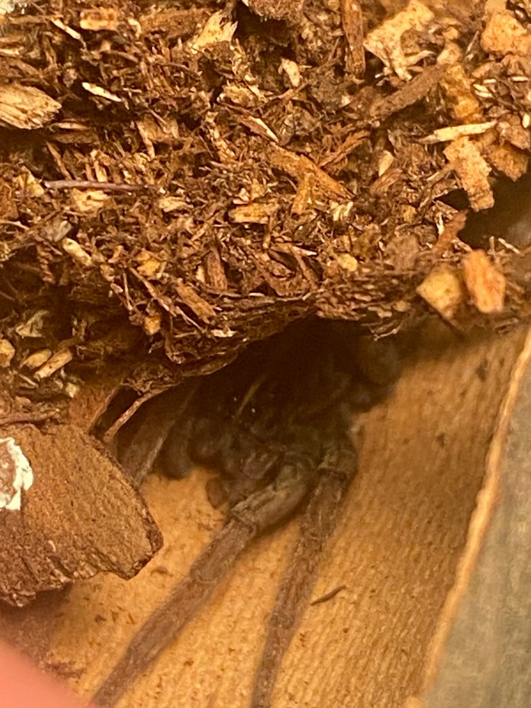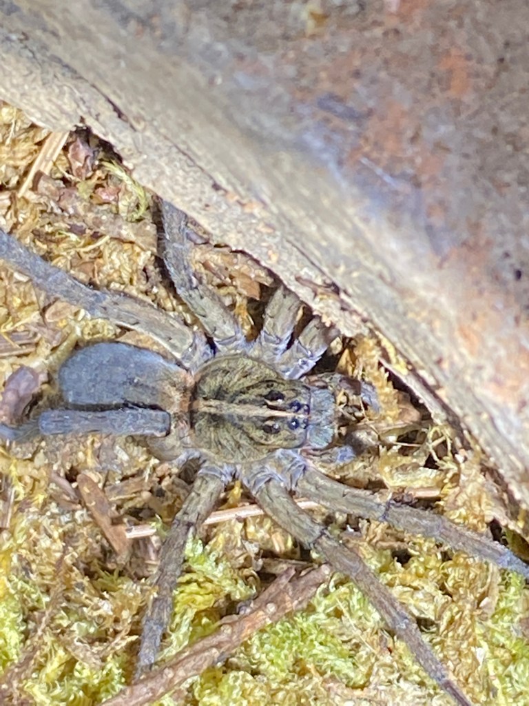 Notice I said, December. In Pittsburgh, wolf spiders should be overwintering under leaves or stones to wait out of the cold. Since the wolf spiders of Hazelwood Green were now in a heated home (68 degrees), the spiders just kept living like there wasn’t a break. They would hide during the day under tree bark strips and come out at night in search of food, which was crickets. Bench really shouldn’t have molted into maturity this early. Being indoors affected his circadian rhythm. In the chilly, weeded lots of Hazelwood Green, there would not be any active females to mate with if he had gone out to mingle. Woody, the older male, began to slow down and stopped eating despite the warmth and regular meal accommodations. Since he was a mature male when I caught him in autumn, he naturally would not have lasted the winter. Having him inside may have given him an extra week or two but he was getting to the end of his life cycle. Woody lasted until late winter (a long time) and called it quits. Bench also crossed the rainbow bridge around that time. The boys don’t live that long.