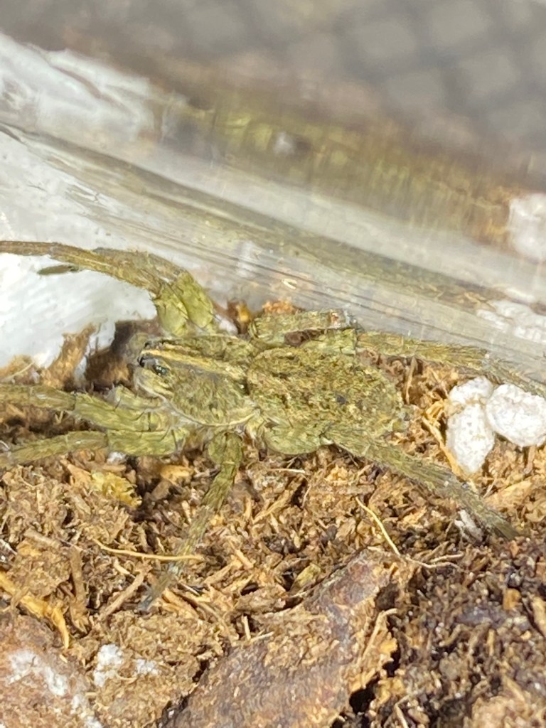 Once back at home with my three Hazelwood Green wolfies, I could see I had caught a mature female, named “Hazel” and a mature male, named “Woody”. Mature means they are fully grown with all of their male and female parts visibly developed and working. The one that gave me such a hard time under the bench was an immature spider (no visibly developed parts) and I wouldn’t be able to tell what sex it was until it molted again. I named that one “Bench”. Hazel, head to butt, was about twenty millimeters and Woody, although leggier, was smaller at about twelve millimeters. Bench was more like around nine millimeters.