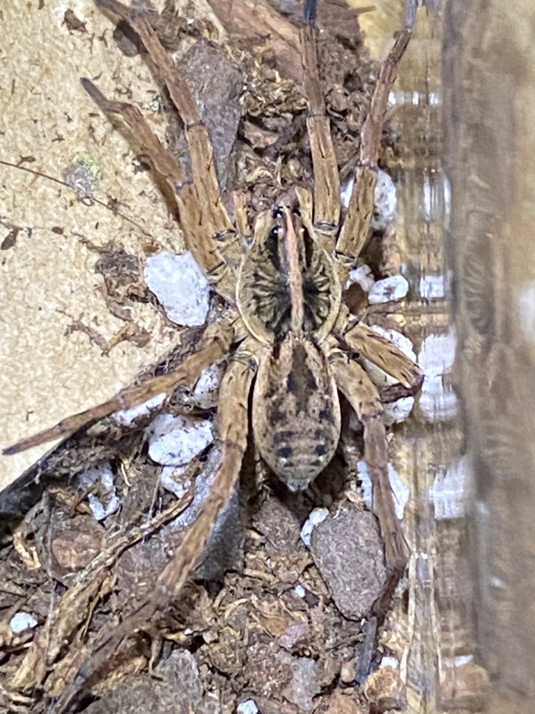 Hazel carried her spiderlings around on her back for about two weeks. They gradually crawled off on their own and started independent lives around the enclosure. They were so small and cryptic I lost track of many of them. I’m sure they were eating each other in addition to fruit flies and the baby crickets I didn’t realize I was raising…a gravid cricket must’ve laid some eggs in there before she became dinner. Wolf spiderlings are fierce! They will tackle prey twice their size! I watched one pounce on a cricket and hold on like a cowboy at a rodeo while the cricket jumped all around! Wolf spiders will flip upside down, grab bugs in the air, and give chase. They are SO fun to watch! Here’s a video of some highlights!