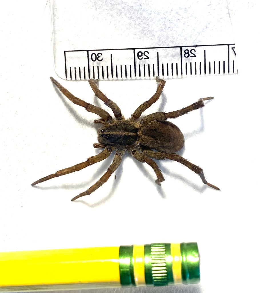 As is the way when looking for spiders, I really didn’t have to go that far or look as long as I did because back at my car, almost RIGHT NEXT to it, were TWO wolf spiders totally exposed on the sidewalk. Of course! I was able to capture them much easier since there were no cracks for the spiders to dart into. Both of these spiders were much larger than the one I caught by the bench. I wasn’t sure which kind of wolf spiders I had, so I kept all three for identification and to use for the upcoming program at the end of October.