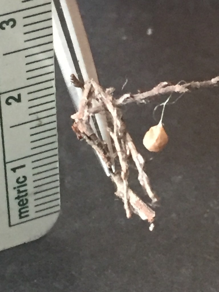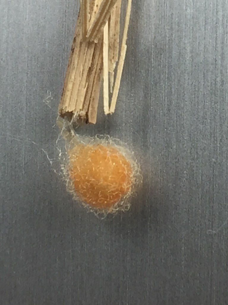 I found an Argiope aurantia crawling across a concrete plaza on a cold night in November. This is really odd behavior for this type of spider which would normally be found in a web. They don’t walk well on the ground as their legs are better suited for silk stepping. She was struggling and fumbling. In November, these girls are at the end of their lives. She looked fat and was probably full of eggs. I took her home and set her up in a container and sure enough, overnight, she attempted to deposit her eggs, but her attempt failed. She was dead the next morning. I felt so sorry for her. She did her best with what little strength she had left. She made the top and bottom of her sac but they were in two different places. Her eggs were laid in the top half with no bottom. They basically dripped down hanging like a yellow stalactite. I knew it was probably never going to work, but I gently gathered the exposed eggs and piled them onto one of the sac halves. I used a small ball of cotton as a lid and wound some of her silk lines around to hold it in place. I suspended the sac from a twig and waited. Nothing happened. Meh, it was worth a shot, long as it was. I included this story to highlight the complicated process we usually don’t get to witness and also the innate drive spiders have to reproduce, even on their last legs!