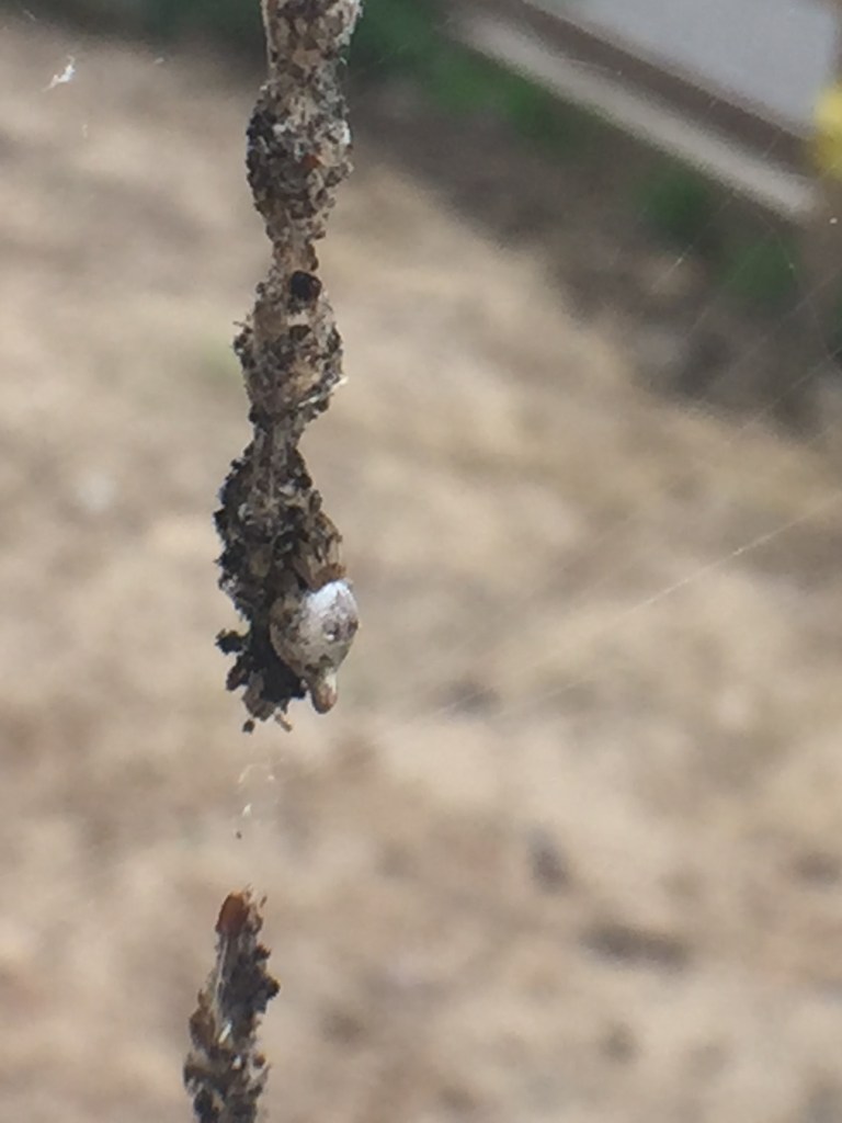 A few spiders incorporate their sacs in their webs. The trashline orb weaver (Cyclosa genus) has them mixed in with bug remains and other debris in a vertical line. The mom sits in that line, too, and you often can’t tell which lump is the actual spider. The labyrinth spider and basilica spider also bunch their sacs in a row, but more conspicuously.