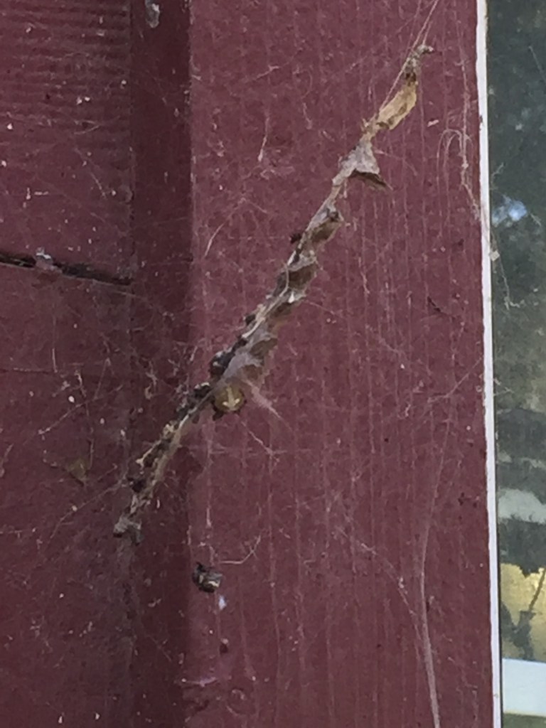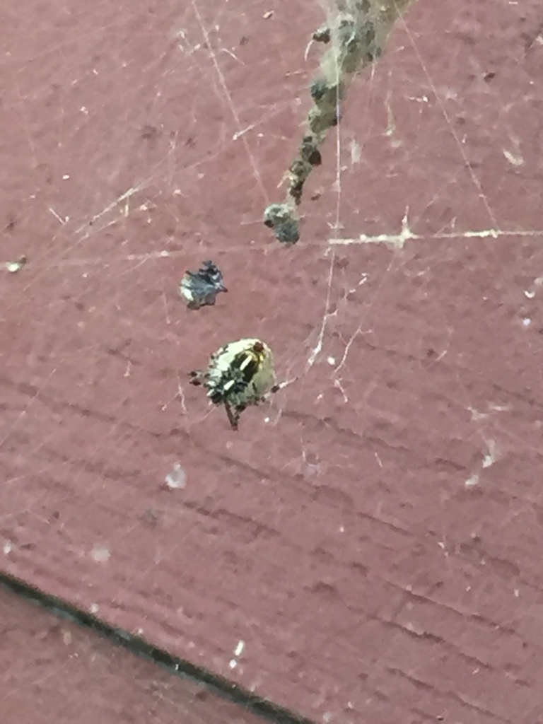 One of the most fascinating spiders ever, the Pirate spider! They don’t make their own webs. They invade existing webs and eat the resident spiders using luring tactics and very potent venom (potent with spiders, not humans). The egg sacs have a reddish, woolly appearance. They seem to be left suspended in random places and are left on their own. I’ve found the actual spider in park restrooms, friend’s dining rooms, and outside along concrete walls. They are around five millimeters long and the first two pairs of their front legs are really, really spiny. Watching these guys doing their pirate thing is amazing although I feel badly that they’re eating other spiders. More info on these guys can be found in the Pittsburgh Pirates.