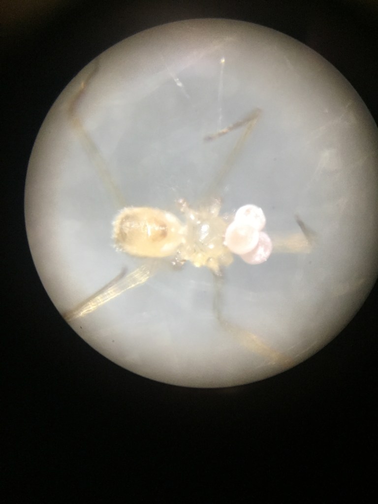 This tiny little spider sneaks its food from other spiders. I found this one in a golden silk orb weaver web. The size difference between the two spiders is so great that the dew drop spider lives in the web undetected and eats all the little stuff the big spider ignores. Its egg sac hangs off of a tiny stalk and is only a few millimeters wide.