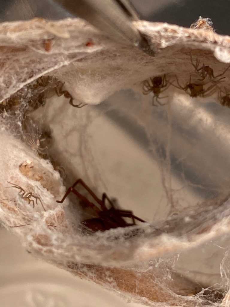 The Brown Widow (Latrodectus geometricus) is not found in Western PA, but is becoming more common in the southeast as an introduced species. There is concern that they are displacing the native black widows. They are definitely numerous and more easy to find. Brown widows have a very distinct egg sac that resembles a flail. Other widow species egg sacs do not have these projections. I found out about “dark brown” widows this way. I thought I had caught a Southern black widow (Lactrodectus mactans) after only finding brown widow after brown widow. I was bummed to find I just had a dark version of another brown widow because it made a spiky egg sac. The egg sac was the diagnostic.