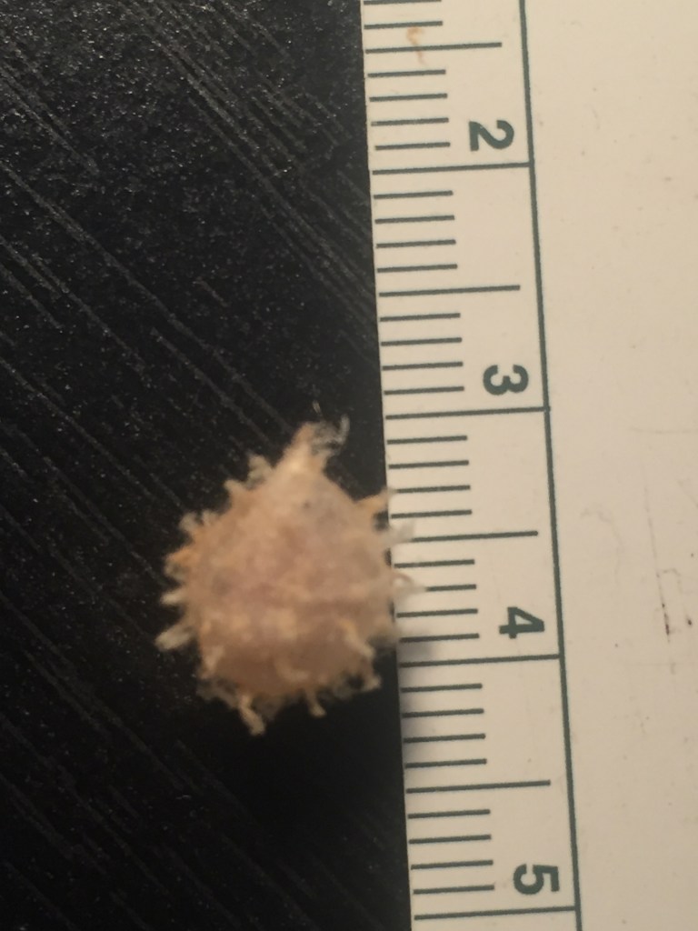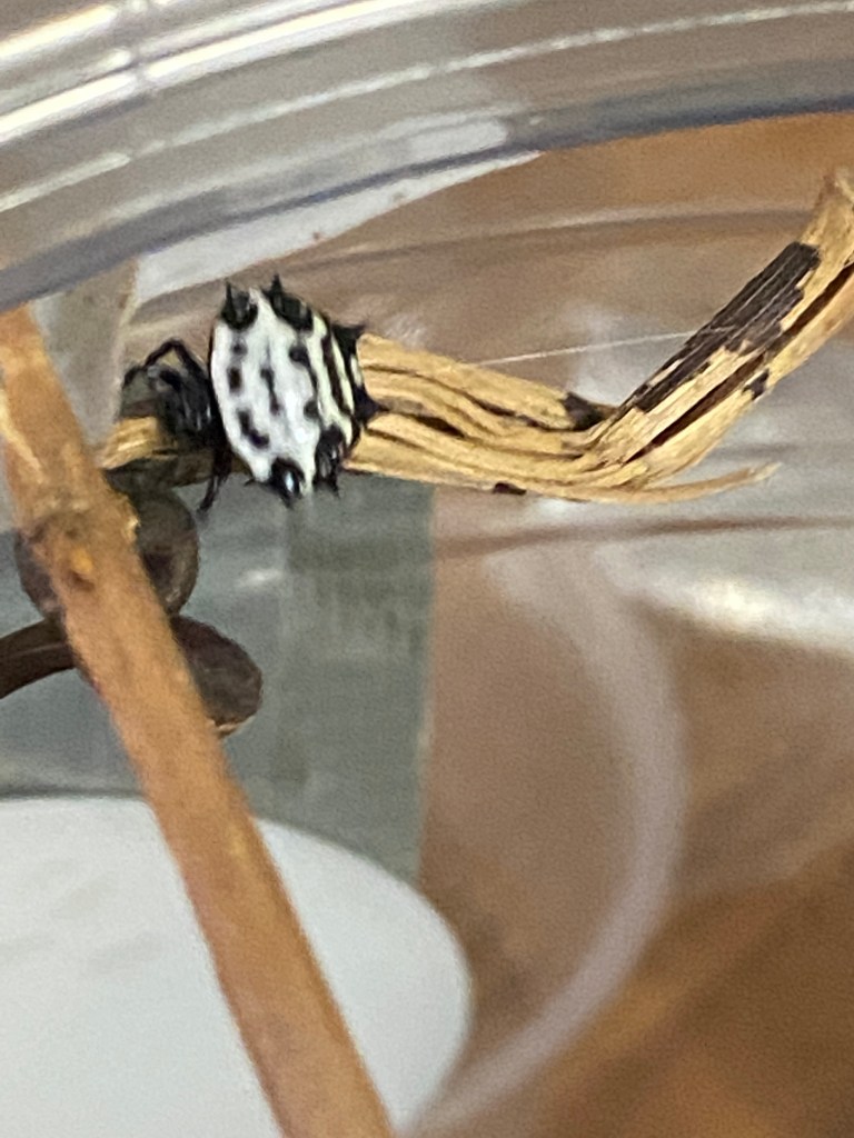 Since we’re checking out spiders from the southeast, here is the green, “zippered” egg sac of Gasteracantha cancriformis, commonly called the Spiny-backed orb weaver. The spiny-backed orb weaver is about the size of a penny, but makes dinner-plate-sized webs in big openings, like between trees. The frame attachment lines which hold the orb web can easily span several feet and are usually found in low-traffic areas. I was keeping a wild caught female in captivity and I didn’t know it, but she had mated, and the green, silken sac appeared. I imagine the silk is green to blend in with leaves. Since there were no leaves, she used the side of the plastic container and it stood out right away. I could not remove the sac without damaging it so I cut the plastic around it. That’s what you see in first photo. Once the mom deposits her eggs, they’re on their own! Despite the pointy, jagger-lookin abdomen (jagger means thorns in Pittburghese), these spiders are completely harmless!