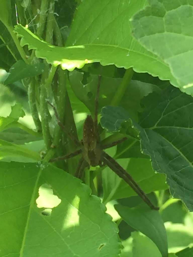 Spiders in the Pisauridae family are often mistaken for wolf spiders due to their large, leggy sudden appearances in wood piles and along stream banks. They have a characteristic splayed resting posture that makes them look enormous. Like wolf spiders, Pisaurids tote their precious package around with them. Unlike wolf spiders they carry the sac with their chelicerae (fangs) whereas wolf spiders carry theirs behind them like a tow truck. The egg sac is bluish in the left pic below, but that was quite odd. I still don’t know why it was blue. They are typically off-white and adorned with random dirt and debris and can be as large as an inch in diameter. When the eggs are ready to hatch, pisaurids will fasten the sac to vegetation and weave a nursery web around it. The spiderlings hatch into the web with mom on the premises. They don’t climb on her like they do with the wolf spiders, but the babies hang out communally until dispersal. Since these spiders are hunt/ambush spiders, they don’t make a capture web so if you see one hanging around a plant that has a good bit of silk nearby, that’s probably the nursery!