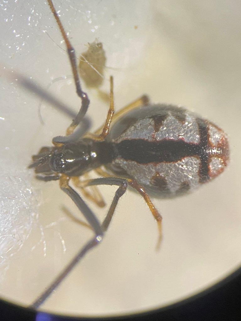 This small cottony poof is made by the Pityohyphantes genus, commonly called hammock spiders. Their web looks more like a dome rather than a hammock. These spiders are smallish, around five to six millimeters from head to butt. They have exceptionally beautiful markings and are commonly found across North America. I’ve found the spiders among spicebush shrubs in the woods, hiding under tree bark, and on the wall in a composting toilet restroom in Ohio. The moms fasten their egg sacs among the leaves and twigs and the spiderlings are on their own from there.